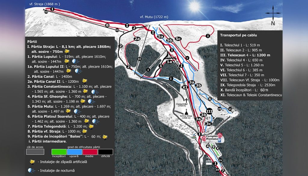 În total, sunt amenajate 12 pârtii de schi, fiecare dotată cu o instalaţie de transport pe cablu. Cinci dintre acestea sunt echipate şi cu iluminare nocturnă, permiţând astfel utilizarea pârtiilor până seara târziu. Pârtiile sunt menţinute într-o stare excelentă pentru schi, datorită eforturilor de întreţinere şi bătătorire a zăpezii cu utilaje specializate. Cu inaugurarea telegondolei şi a telescaunului de pe Vf. Straja, au apărut şi pârtii noi în staţiune. Cea mai lungă dintre ele este Pârtia Straja, care se întinde pe o distanţă de 8,1 km.